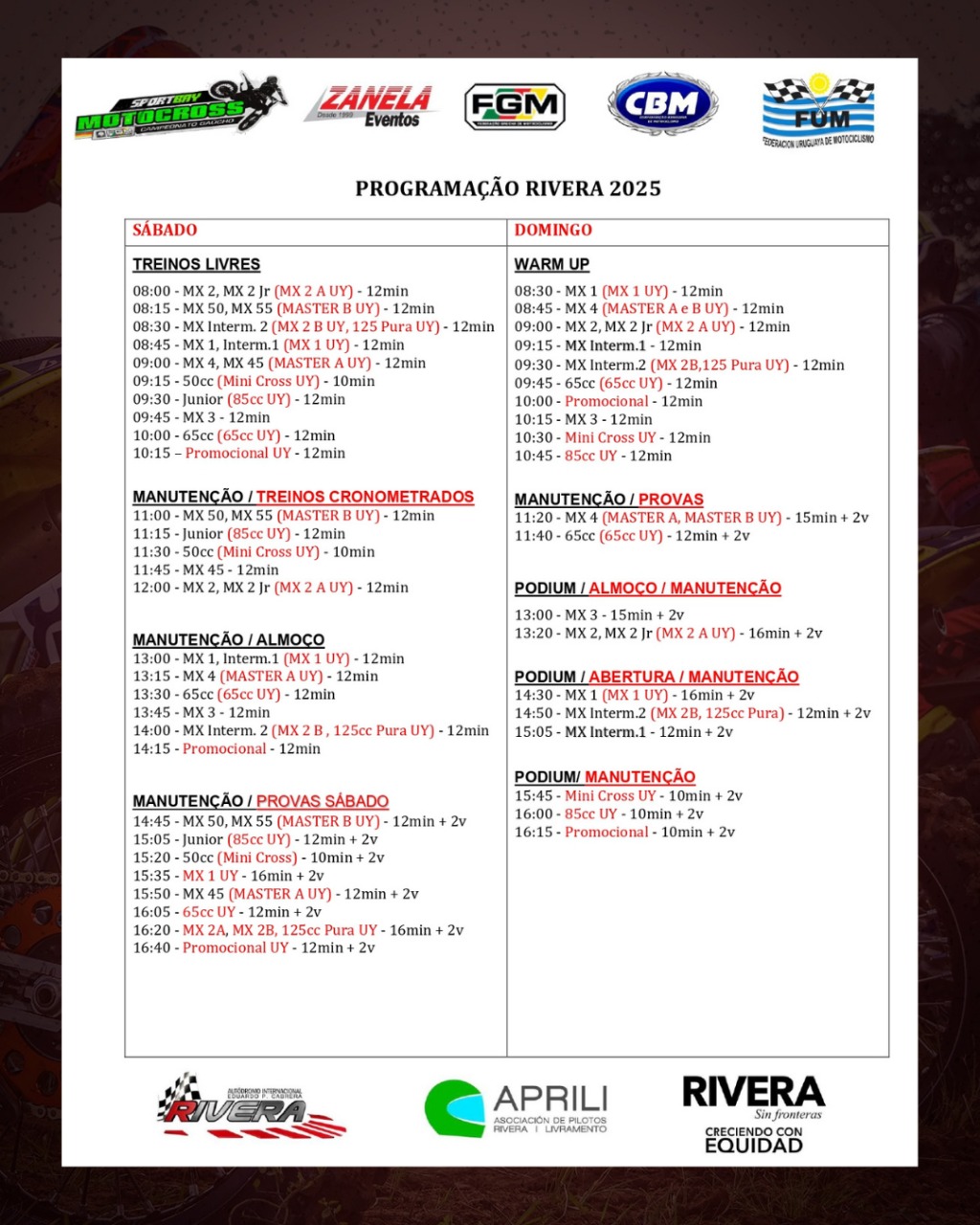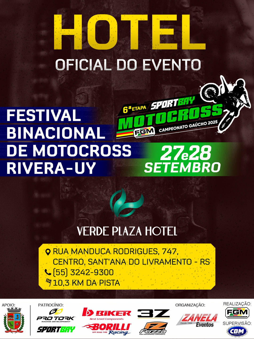 Nos dias 27 e 28 de setembro, Rivera (Uruguai) acontece o Festival Binacional de Motocross, que reunirá grandes nomes do esporte e marcará a realização da 6ª etapa do Campeonato Gaúcho Sportbay de Motocross 2025, sob organização de Zanela Eventos e da Federação Gaúcha de Motociclismo (FGM).